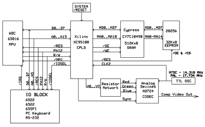 The video system uses the transparent DMA method. During the low phase of PHI2, the CPLD accesses RAM and outputs pixel data to the video system. During the high phase of PHI2, the CPLD lets the MPU access RAM.